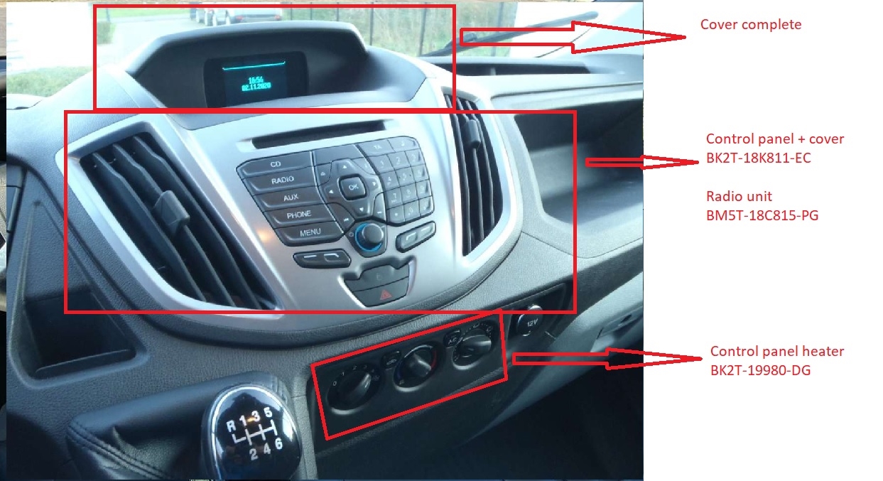 Beste, #BR# heeft u volgende onderdelen liggen? #BR# - Cover dashbord Complete (without screen) #BR# - Control panel Radio + cover (BK2T-18K811-EC) - Radio unit BM5T-18C815-PG #BR# - Control panel unit (BK2T-19980-DG) #BR# #BR# mvg, Bart | ||||||||||||||||||