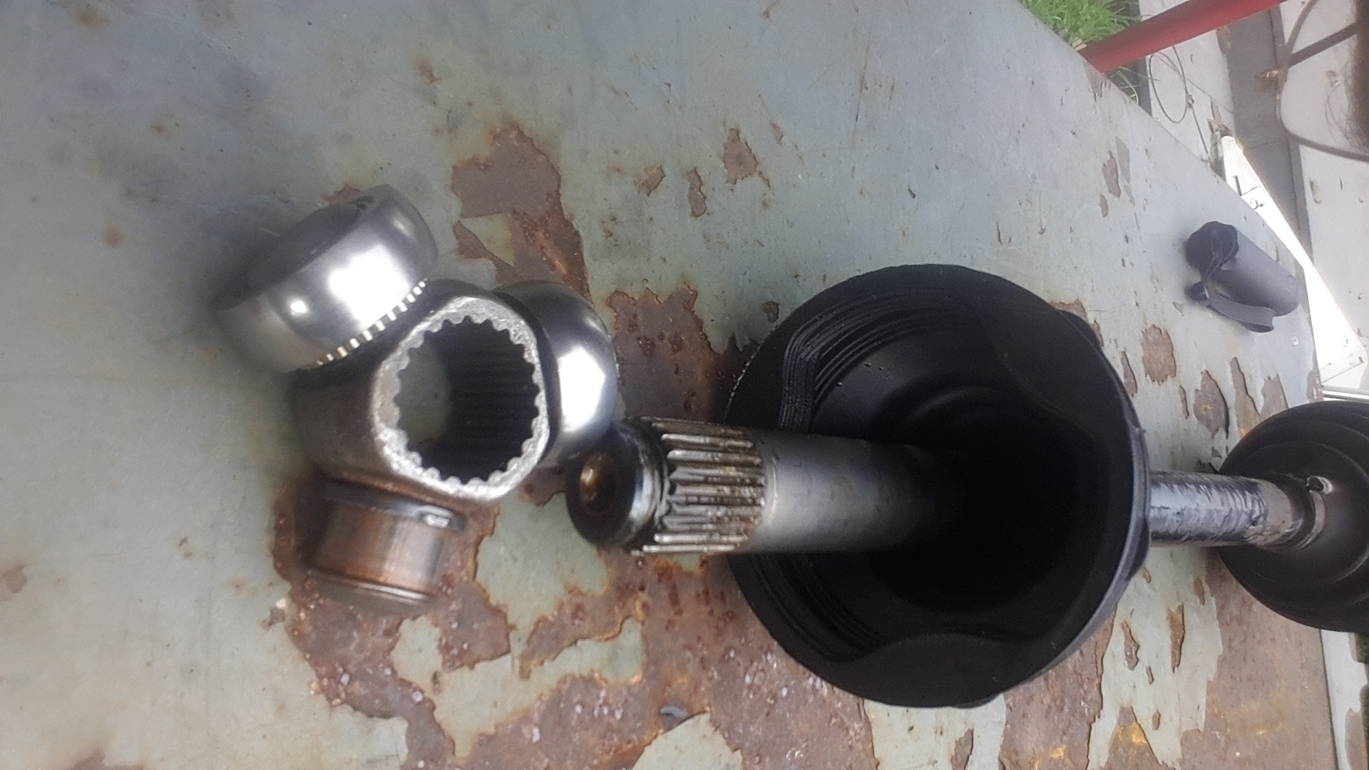 Cardanas chauffeurskant #BR# #BR# Alleen de ring in de binnenste homokineet #BR# - die in de boite schuift - is ook al goed , het is op de binnenring ( met de karteling die over de as schuift ) waar 1 van de 3 naaldlagers kapot is . | ||||||||||||||||||